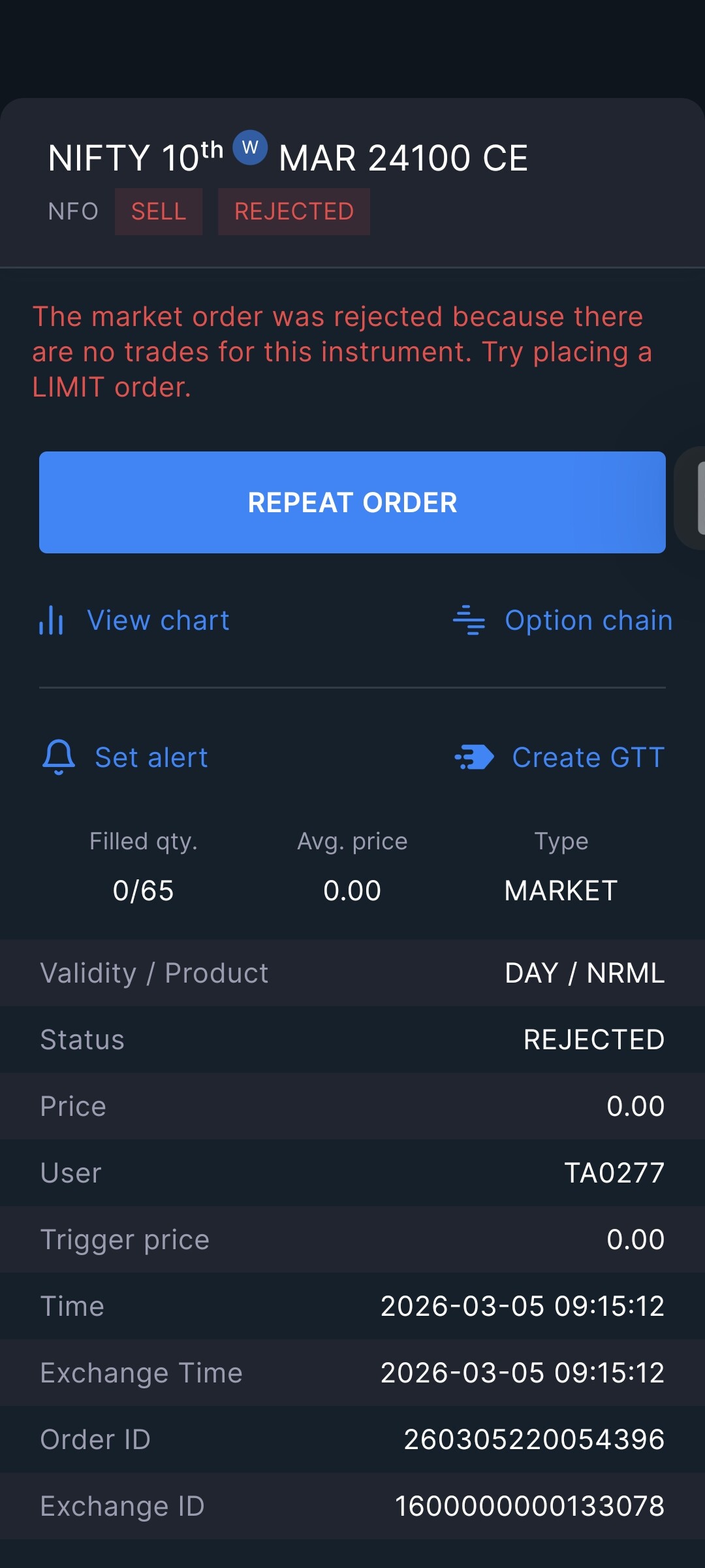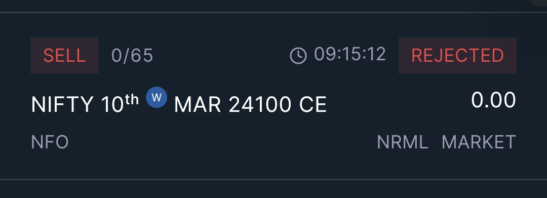 Within the order it shows this red statement that says there are no orders for this instrument. Thats not true. There were orders already by 9:15:01 sec. I placed order at 9:15:12 secs.